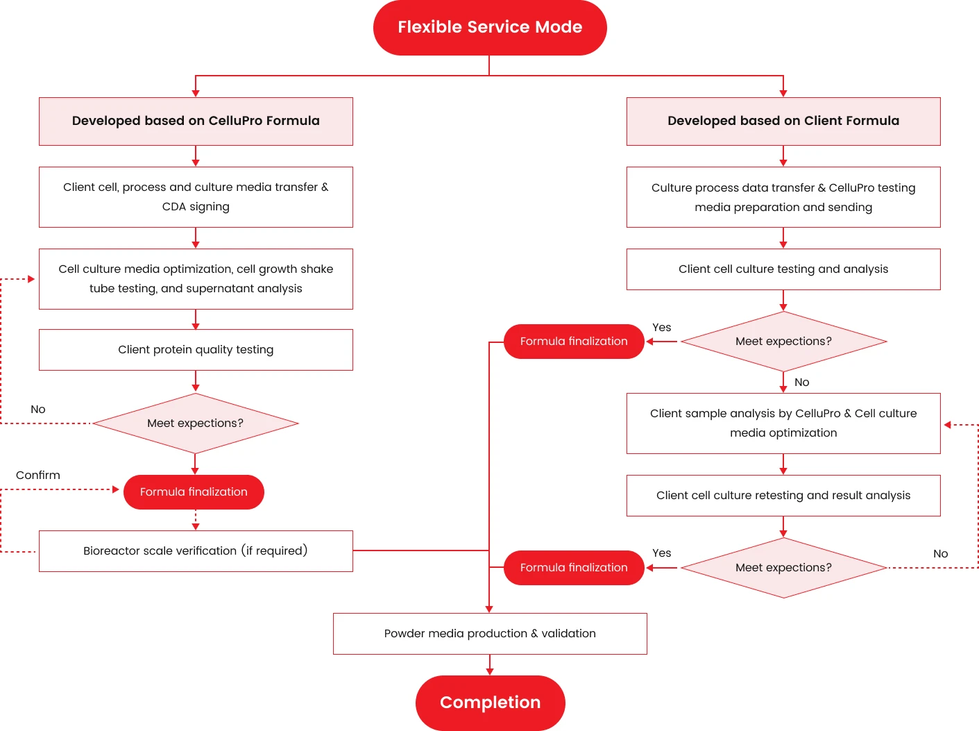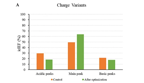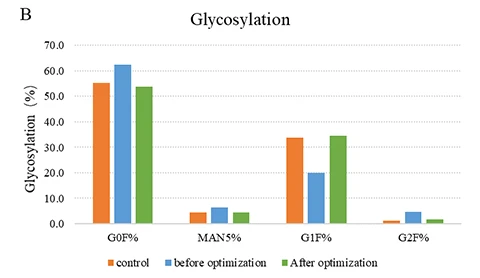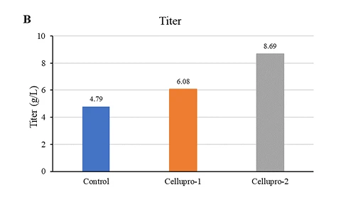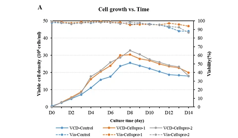 Figure (A): While maintaining consistency with the original process, CelluPro customized media significantly increased the viable cell density (VCD) and peak VCD of the client‘s original process, and maintained good cell viability (Via) in the late culture stages.